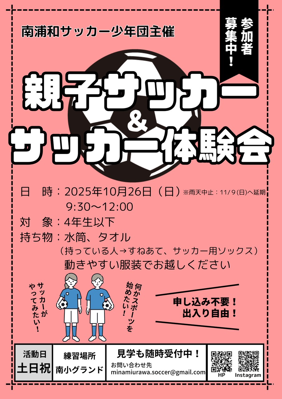 10月27日は、選挙により南浦和小G使用不可のため、親子サッカーは11月10日に開催します。